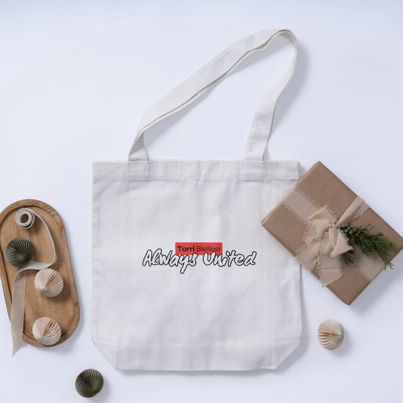 Borsa in cotone con manici lunghi di dimensione 38x42 cm circa.